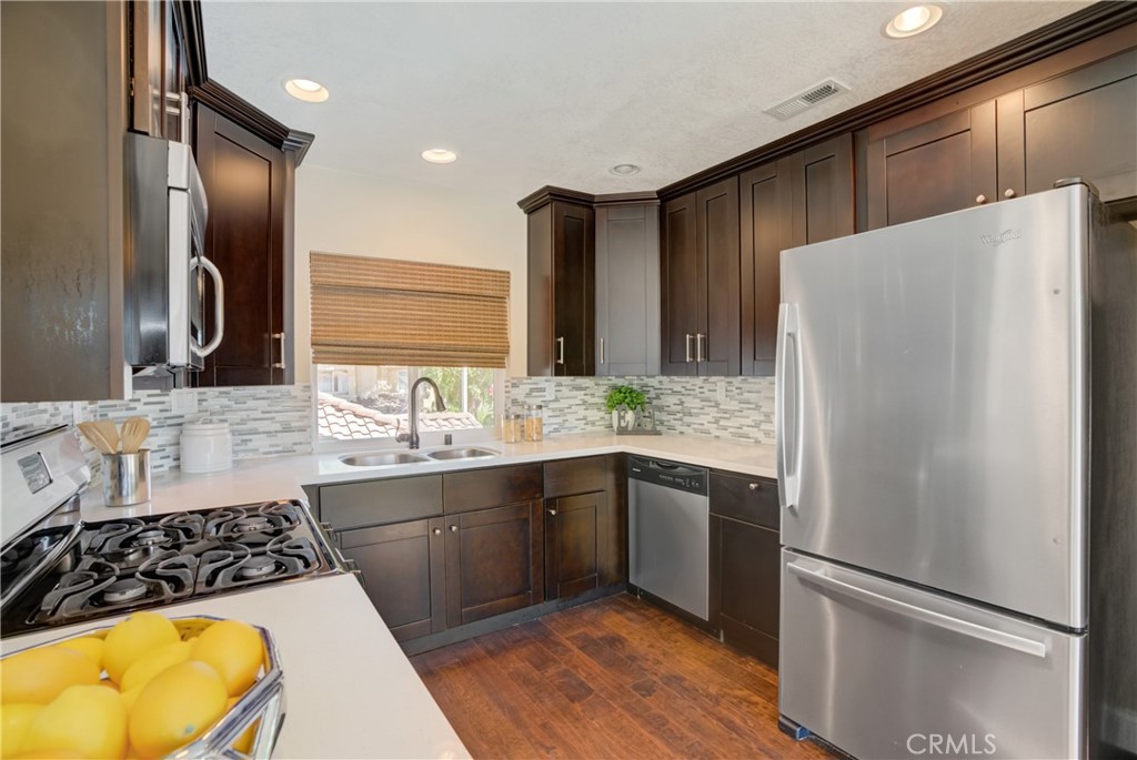 Nestled within the highly sought after Sierra Verde enclave of RSM, this exceptional residence epitomizes chic sophistication. Positioned adjacent to the picturesque Tijeras Creek Golf Course, this home exudes modern elegance and timeless allure. Upon crossing the threshold, you'll be greeted by an impeccably designed interior bathed in natural light. The tasteful color palette, enriched by warm, neutral tones, sets the stage for an inviting atmosphere. Crown molding, distressed espresso wood flooring, and tall baseboards create an atmosphere of refined luxury. Alluring new fixtures and meticulously crafted six-panel doors accentuate the home's impeccable attention to detail. The living room beckons with its soaring vaulted ceilings and a captivating wood-burning fireplace adorned with exquisite glass tile. The adjacent dining room, enhanced by a contemporary chandelier, seamlessly connects with a generous slider leading to an expansive wrap-around balcony, perfect for alfresco dining and entertaining. A chef's dream, the kitchen has undergone a complete transformation, boasting rich espresso shaker cabinetry, sleek quartz countertops, a shimmering glass tile backsplash, and top of the line stainless steel appliances. Recessed lighting illuminates this culinary haven, creating an ideal setting for creativity. Down the hallway, you'll discover the first of two primary bedrooms. This true primary suite is a sanctuary of comfort, offering dual walk in closets, lofty vaulted ceilings, and a private second balcony creating an idyllic retreat. The en-suite bath pampers with dual sinks espresso cabinetry quartz counters a new toilet, an exquisite tub, and a decorative glass tile surround. The second bedroom mirrors the same attention to detail and luxury, with easy access to the impeccably upgraded hall bath, featuring the same high-quality finishes as the primary bath. Convenience is further enhanced by an indoor laundry room that leads to stairs descending to your expansive two-car oversized attached garage. This exceptional residence is complemented by a vibrant community offering a refreshing pool, a soothing spa, and a charming park, inviting you to unwind and enjoy a resort-like lifestyle. Opportunities like this are rare and fleeting. Act swiftly this remarkable unit will undoubtedly find its new owner quickly. Don't hesitate; take action now, because a home of this caliber is a true gem that won't be available for long.